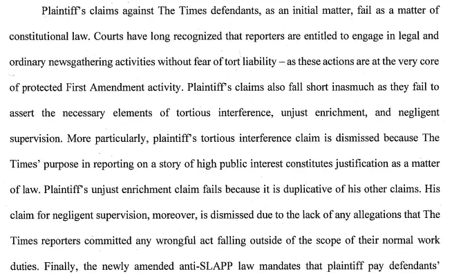 The Court concluded that as relating to the New York Times defendants the causes of action constituted a SLAPP lawsuit, i.e. a Strategic Lawsuit Against Public Participation intended to stifle protected free speech.